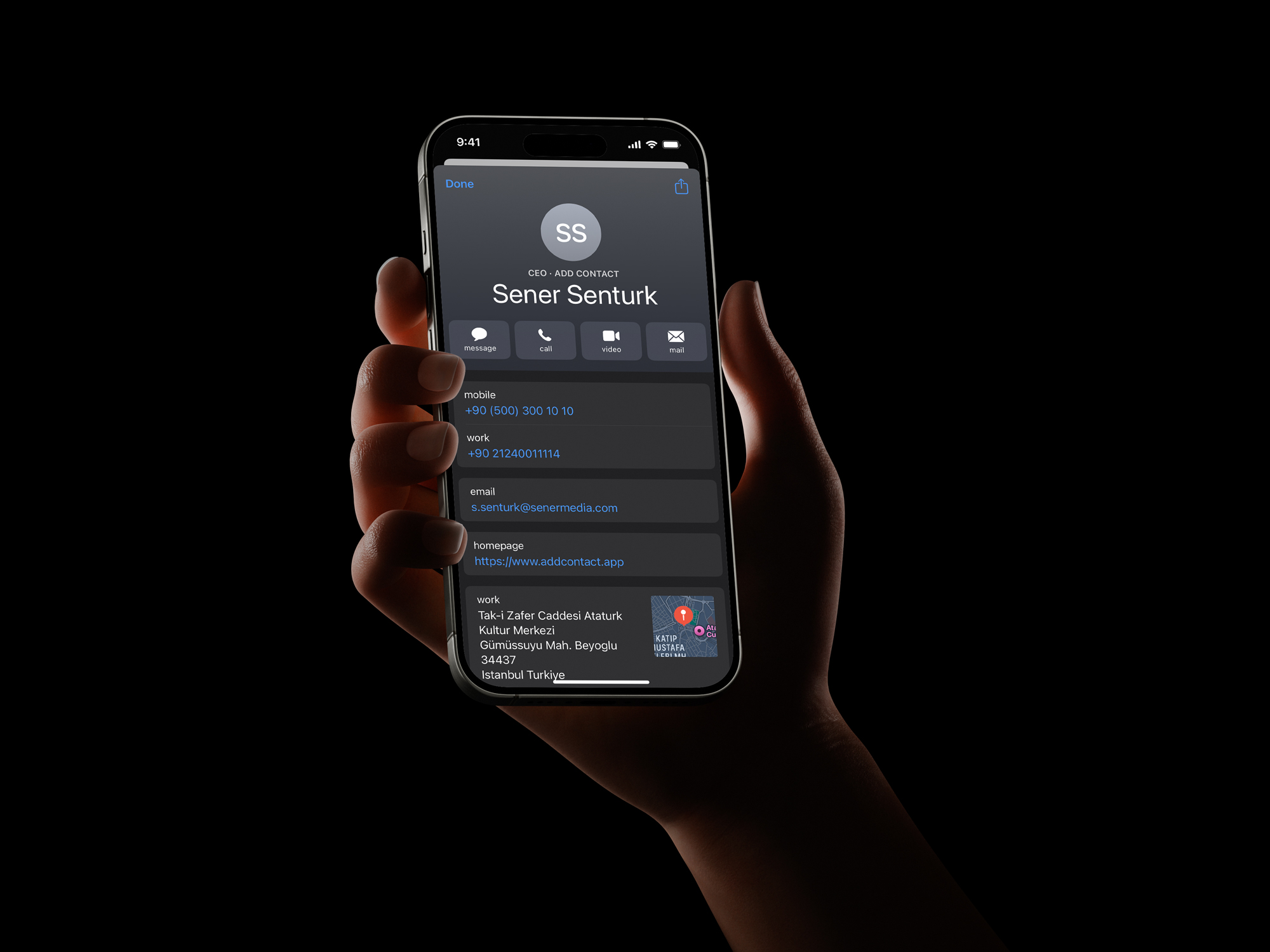 Add Contact, şirketler ve markalar için toplu dijital kartvizit ve QR kod çözümleri sunar. Ekibinizin iletişim bilgilerini rehber formatında hazırlar ve QR kod ile anında telefona eklenmesini sağlar.